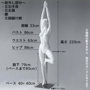 素材 FRP(強化ガラス繊維) ラッカー塗装 サイズ(cm) バスト ウエスト ヒップ 肩幅 高さ 86 63 88 33 220 その他サイズ(cm) 腿周囲 頭囲 足サイズ 股下(ベースまで) 48 51 22 79(85) ベース スチール製 ヘアライン仕上げ 40×40cm 重量:約7kg ウエストリフトタイプ 重量 約15kg (本体 約8kg・ベース 約5kg・シャフト 約2kg) 注意事項 着脱可能部分/左右手首・肩・腰・左脚付根 ※関節部は動かすことができません。
