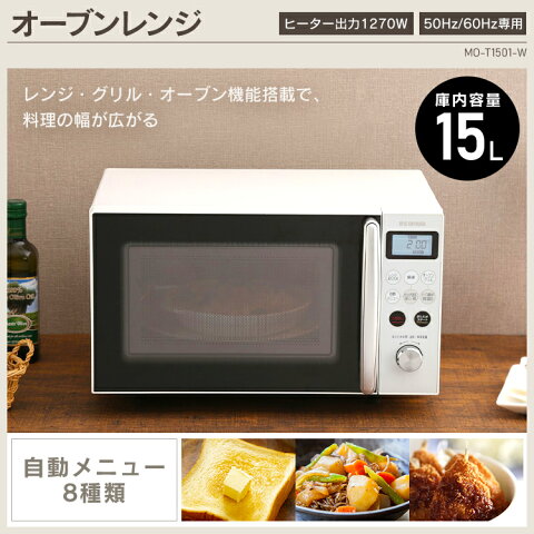【オーブンレンジ 15L MO-T1501-W ホワイト】(アイリスオーヤマ)●商品サイズ(cm)外寸:幅約45.5×奥行約32.5×高さ約28.0(ハンドル・突出部を除く)加熱室の有効寸法:幅約30.5×奥行約28.0×高さ約15.0●本体重量(丸皿含む):約12kg●庫内総容量:約15L●電源:AC100V(50Hz/60Hz)【レンジ】●定格消費電力:50Hz:750W、60Hz:1000W●定格高周波出力:50Hz:500W、60Hz:600W●発振周波数:2450MHz●タイマー:10秒〜15分【グリル】●定格消費電力:1300W●ヒーター出力:1270W●タイマー:10秒〜95分【オーブン】●定格消費電力:1300W●ヒーター出力:1270W●温度調節:40℃(発酵)、110〜200℃●タイマー:10秒〜95分(検索用:家電セット 家電 セット 新生活セット 3点 新生活 1人暮らし 一人暮らし ひとり暮らし 生活家電 キッチン家電 冷蔵庫 洗濯機 オーブンレンジ レンジ)★